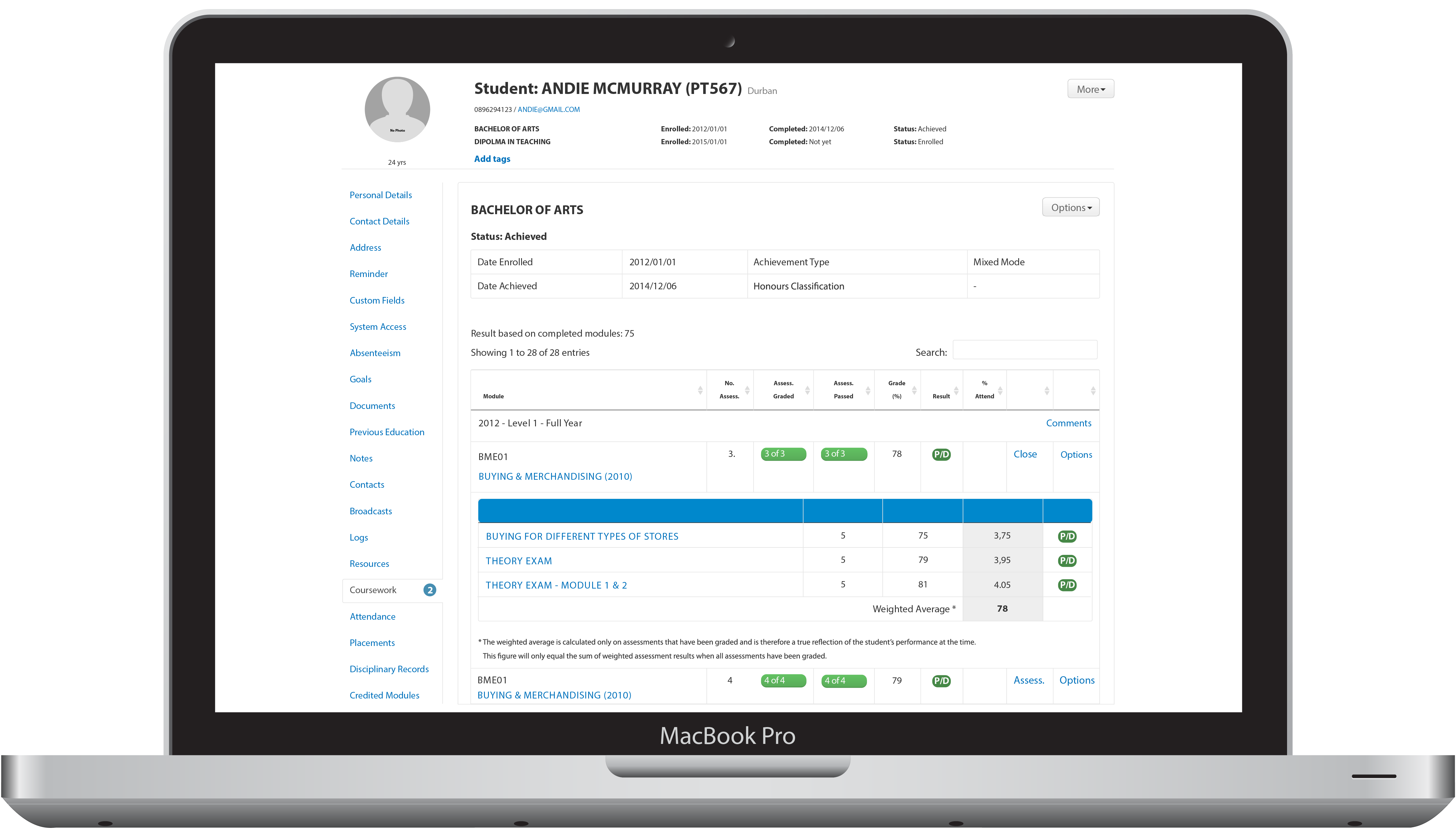 Manage all your student details, enrol students into courses and track their academic progress through the grading of assessments. You can also create your own data capture fields to make sure you capture all the student data needed. Create bar-coded student cards, record student absenteeism, upload important documents like ID copies, and much more.