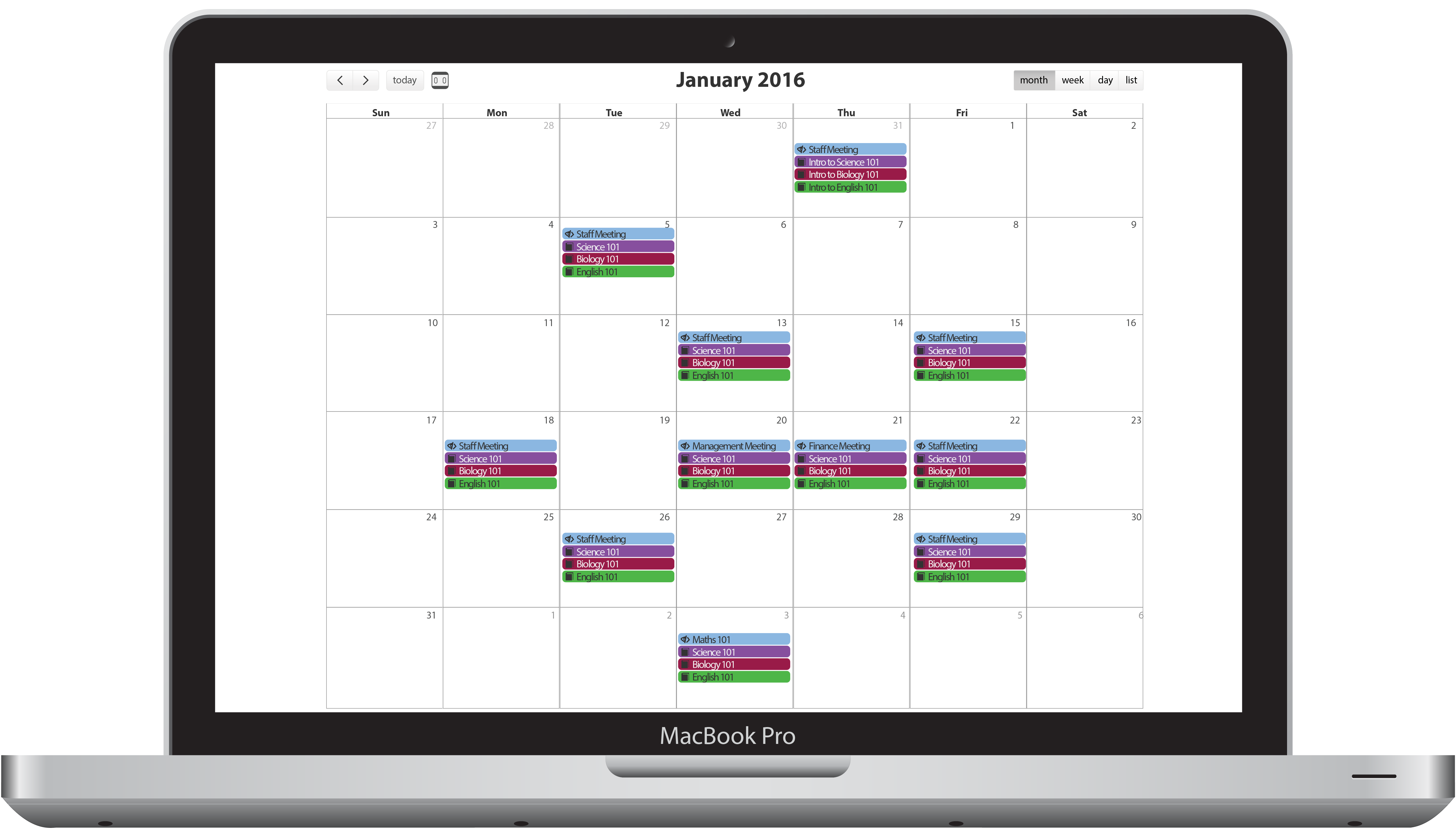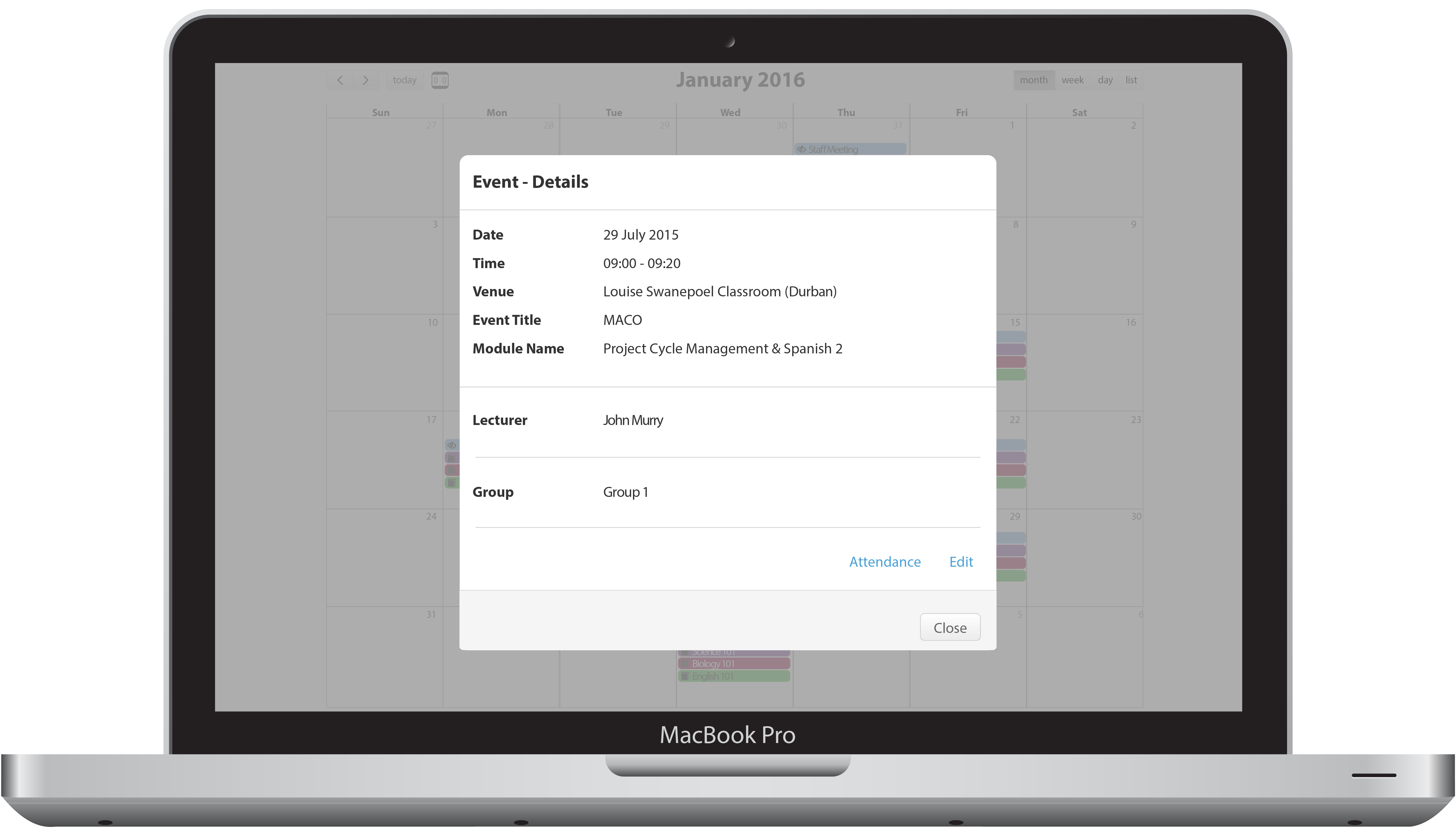 Manage your institution’s lecture timetable and the allocation of resources. For each lecture, you can specify which lecturer and classroom to use. The system will alert you to any double booking conflicts you may have made. You can share these timetables with the lecturers and students. You can also use the timetable feature to record student lecture attendance.